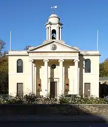 The church is an example of square Georgian neoclassical architecture, covered in pale limestone, with the nave inside built of brick. It has a four-columned Ionic portico at the front, with a blank pediment, and further pairs of pillars on each side. A square tower rises above the church, with clock faces and Corinthian pillars, above which is an octagonal cupola with a roof shaped like a bell.[9] Inside the church is an eight-bay Corinthian arcade, with Corinthian pilasters on the east wall. Clerestory windows sit above an entablature, and the nave has a low arched ceiling with ribs and oval panels. The church also has galleries.[10]