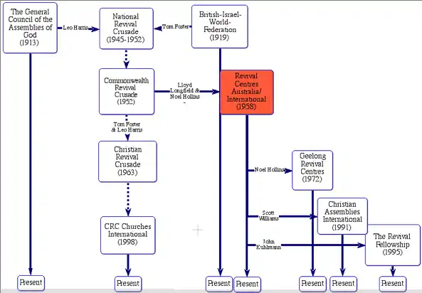 | Separations | Geelong Revival centre (1972) Christian Assemblies International (1991) New Delhi Revival Centres The Revival Fellowship (1995) |