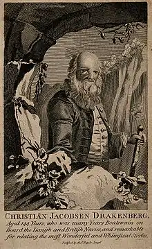 Christian Jacobsen Drakenberg (18 November 1626 (?) – 9 October 1772) was a Norwegian sailor who, according to his information, was born in 1626 in Blomsholm, Norway and thus reached the age of 145.[1][2] The claims have since proven implausible but at the time it was widely accepted and contributed to his considerable fame. Drakenberg led a colorful life as a sailor; he traveled much in Europe and Asia, was held captive by pirates on several occasions and fought in 3 wars under different Danish kings. He retired at the claimed age of 86, and in light of his impressive story he was awarded a yearly pension by the Danish king. Drakenberg spent the last years of his life living with beneficiaries and friends until his death in 1772 in Aarhus, Denmark.[3][4]