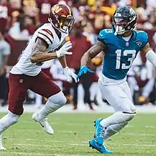 On March 16, 2022, Kirk signed a four-year, $72 million contract with the Jacksonville Jaguars.[31] In his Jaguars debut, Kirk had six receptions for 117 yards in the 28–22 loss to the Washington Commanders.[32] In the following game, he recorded two receiving touchdowns in the 24–0 victory over the Indianapolis Colts.[33] In Week 10, against the Kansas City Chiefs, he had nine receptions for 105 yards and two touchdowns in the 27–17 loss.[34] In the 2022 season, Kirk achieved career-highs with 84 receptions, 1,108 receiving yards and eight touchdown receptions.[35]