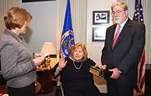 Griffin is sworn in as commissioner by Cari M. Dominguez while her husband looks on.