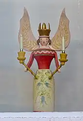 Christmas angels are always made with wings to accentuate their heavenly character. They can be lacquered colorful or in natural wood colors.[2] Among the colorful angels the color and decoration of the wings indicate the respective manufacturer who uses these features as a kind of trademark.
