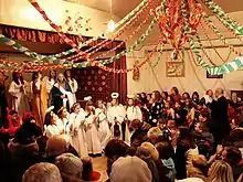 The Day of Saint Nicholas on 6 December is the unofficial beginning of the festive season in Poland.[4] Well-behaved children receive small gifts on the day, whereas naughty children receive a lump of coal or a twig, called "rózga". The highlight of the holiday is the most significant day, Christmas Eve on the 24 December. Polish Wigilia begins with the appearance of the first star, which corresponds to the Star of Bethlehem. During preparation, hay is spread beneath the tablecloth as a reminder that Jesus Christ was born in a manger.[5] According to tradition, an empty place setting is symbolically left at the table for the Lord or, for a lost wanderer who may be in need of food or shelter.[5] The supper begins with the breaking of the Christmas wafer known as "opłatek", a custom observed exclusively in Poland and two other countries. The meals must be vegetarian (with the exception of fish) as a sign of fasting and twelve different dishes are made, thus symbolizing the Twelve Apostles. The celebration ends with the exchange of gifts and a midnight mass in churches.