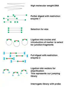 Chromosome jumping library is different from chromosome walking due to the manipulations executed before the cloning step. In order to construct the library of chromosome jumping, individual clones originate from random points in the genome (general jumping libraries first basic protocol) or from the termini of specific restriction fragments (specific jumping libraries alternate protocol) should be identified. [1][4]