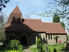 The 19th-century restoration of Church in the Wood defines its present appearance.[18] The only surviving work from the medieval era is in the west and north walls of the nave and in the tower, where some stonework, timbers and an ancient bell survive.[5][9] The church is built of stone rubble, the roof is tiled, and the pyramid-shaped cap on the tower is tile-hung;[9] it was originally weatherboarded.[21] The bell, cast between 1371 and 1392, is the oldest in Hastings and one of the oldest in Sussex.[5]