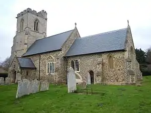 All Saints' dates back to at least Norman times[1] and consists of a nave with two bays and a chancel dating to the 12th and 13th centuries, respectively. The tower and south porch are 15th century. The tower is of three stages with a stair turret and battlemented parapet and has eight gargoyles. The thin red tiles visible on the south side of the tower are thought to mark the day by day progress of the workmen. Major renovation of the tower was carried out in 1996 when seven of the eight gargoyles were replaced with replicas carved by Rattee and Kett. These represent opposites: Life and Death; Saint and the Devil: King and Queen, and a Lion and a Man. The clock was installed to commemorate the Diamond Jubilee of Queen Victoria in 1897; it was restored in 1991. The buttresses supporting the nave date to the 15th-century, while those supporting the chancel are 19th-century.[4] The roof is of Welsh slate with coped gables, while the structure is built of flint and ironstone rubble walls with ashlar dressed stone and buttresses. The 14th and 15th century fenestration is in the Perpendicular style.[3][5]