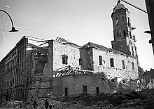 In the 1920s it received a night-time decorative lighting and a heating system, but no changes were made to the building. In 1938 the church was turned into a museum. During the Allied Siege of Budapest of 1944 several bombs hit the building: cracks appeared on the tower; the northwest corner of the floor collapsed; the roof of its long house, the walls of the sanctuary and the chapels were almost completely collapsed.[1] However, the real destruction of the Church of Mary Magdalene was not by the war but the "restoration" of the 1950s: in vain in 1946 Kálmán Lux made the plan to restore the church, in vain the rebuilding of the roof and the shrine began in 1950, and the church building was demolished at the personal request of Mátyás Rákosi,[1][2][3] an anti-church communist regime. Only its bell tower and the side chapels escaped from the destruction, thanks to József Csemegi for its rescue as a Rákosi pantheon.