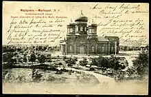 The church was built of brick in the pseudo-Byzantine architectural style and had three domes and three chapels in honour of St. Mary Magdalene, St. John the Baptist and in memory of the Intercession of the Blessed Virgin, consecrated and celebrated the Divine Liturgy.[3]