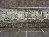 During the excavation, the sole trace of the second church — the foundation of an irregular three-sided apse— was found. How the building was constructed toward the narthex remains unclear. However, it is known that this side ended with a tower because Jehan Camal, the local priest, bequeathed 50 livres towards the repairing of the tower and the installation of a bell in his will of 1517.[16] This tower is probably the same one mentioned in the 17th century, which was demolished for the construction of the 18th century church.[17] The size of the choir/chancel suggests a three-apsed construction, maybe similar to the third church.[18] As well as the main altar, a Pouillé ecclesiastical register from 1445 mentioned an altar devoted to Saint Nicholas, and another from 1518 mentions an altar devoted to the Virgin Mary.[19]