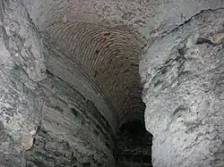 The Martyrion, which lies under the church and behind a gas station, currently houses two shops, an iron workshop and a car wash shop. It can be accessed through a modern opening obtained by enlarging an ancient window.[1] The original structure was a rotunda with an inner circle of columns supporting a dome. The central chamber is a room covered by a lowered dome constructed of brickwork with a height of 5.70 metres (19 ft) and a diameter of 12 metres (39 ft).[4] This room is partially encompassed by a deambulatorium[5] 2.5 metres (8 ft 2 in) wide and 7.5 metres (25 ft) high, which has a horseshoe shape.[1][4] The room gives access towards the east to a rectangular bema.[4] This has at its right the remains of a spiral stairs, possibly used in the past to reach the upper church, and at its left a cell with an apse.[4] The Hagiasma still exists and lies opposite to the Martyrion.