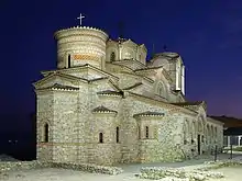 The Church of Saints Clement and Panteleimon (Macedonian: Црква Свети Климент и Пантелеjмон, romanized: Crkva Sveti Kliment i Pantelejmon; Greek: Άγιοι Κλήμης και Παντελεήμων, romanized: Agioi Klēmēs kai Panteleēmōn) is a Byzantine church situated on Plaošnik in Ohrid, North Macedonia. It is attributed to Saint Clement of Ohrid, a disciple of Saint Cyril and Saint Methodius. Archaeologists have come to believe that the church is located on the site where the first students of the Glagolitic alphabet (used to translate the Bible into Old Church Slavonic) were taught in the First Bulgarian Empire.