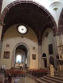 Church San Giulio has a Romanesque Revival and Lombard architectural style, and its front side faces the main square of the town of Castellanza.[2] The key features of the north Italian Lombard Romanesque architectural style are brick and flat and wide facades covering the whole front of the church, often with a big rose window in the middle, above the entrance.[3] The presbyterian pavement (architecture) was built in 1932 and is made of Venetian marble in a mosaic structure. In the pavement are represented geometric figures, and in the middle of these figures is a figure made by squares, with sides of 143 cm.