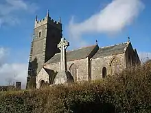 The church of St. James is in the Gothic style.[1] The walls are of coursed slate stone rubble with some granite ashlar in the buttresses of the tower. The roof is gable ended, covered in slate with decorative ridge tiles from the late 19th century.[7] There is a four-stage tower with battlements at the western end with angle buttresses, with a crouching animal gargoyle on top of each buttress.[7] The tower holds six bells. The first two are dated 1620 and the third is dated 1629. The tenor bell has an inscription in old English characters dedicating it to St. George. In 1911 two new bells were added to commemorate the coronation of King George V.[1]