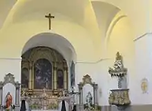 The main altarpiece from the first half of the 18th century represents the birth of Jesus Christ in Bethlehem. In the lower-right corner there is the portrait of the founder Count Louis Colloredo holding a model of the church, his wife Maria Eleonora and their daughter Maria Antonia.[3] The wooden pulpit was also made the first half of the 18th century. On the top there is a statue of Moses.
