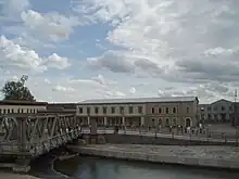 Cinevilla is a backlot in Slampe parish in the Tukums Municipality in Latvia, and was created for the outdoor shootings of the feature film Defenders of Riga. It is the only backlot in Latvia, and consists of different sections, including a section with village architecture, a section with prehistorical dwellings, and one with city streets, with replicas of historical buildings and constructions of Riga, the capital of Latvia. The backlot has a small canal to resemble the Daugava river quays of the Riga old town. The Stone Bridge is also there as well as the historical Lübeck and Pontoon bridges.