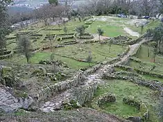 Briteiros is an unusual castros, having its streets arranged into a roughly grid pattern.[8] The "urbanized" area of the settlement includes an acropolis surrounded by the first rampart in an elevated area of about 7 hectares.