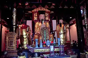 Chinese culture traditionally maintained a distinction between official religion and popular religion. In official religion, worship of the City God was according to the dictates of written legislation and was to be performed by officials and degree holders. The associated activities were designed to help legitimize the state in the eyes of the common people and preserve local social status distinctions.[5] The prescribed sacrifices for a Chenghuangshen are described in the "Auspicious Rites" section of the Da Qing Tongli, the Qing dynasty manual for rituals.[6] The official worship of a City God was a solemn and dignified event, with various ceremonies held inside the temples.[5] The animals and food that were sacrificed to the Chenghuangshen were carefully inspected by the religious officials to make sure that they were good enough for the City God.[6]