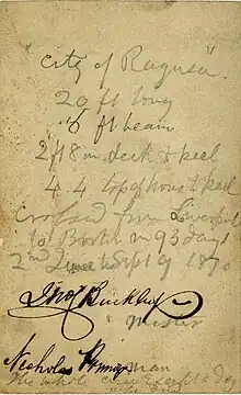 City of Ragusa of Liverpool was a 20-foot (6 m) yawl (in 19th-century terms),[2][3] owned by Nikola Primorac, which twice crossed the Atlantic in the early days of 19th-century small-boat ocean-adventuring. She carried the former alternative name of Dubrovnik, the birthplace of her owner. She was originally a ship's boat of a merchantman. The 1870 east-west trip between Ireland and the United States was crewed by John Charles Buckley, a middle-aged Irishman with seagoing experience, and Primorac, a Croatian and tobacconist. The crew on the west–east return trip of 1871 were Primorac and a "lad" called Edwin Richard William Hayter from New Zealand, who had been a steward on the steamer City of Limerick of the Inman Line.