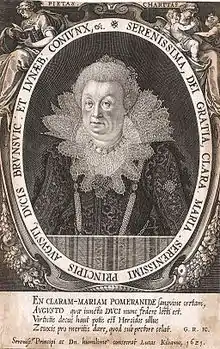 Clara Maria of Pomerania-Barth (10 July 1574 – 19 February 1623), was a member of the House of Griffins and by her two marriages Duchess of Mecklenburg-Schwerin-Ivenack and Brunswick-Dannenberg-Hitzacker.