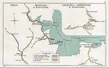 In 1878, the Rosebush and Fishguard Railway (R&FR) was formed, to extend the Narberth Road and Maenclochog Railway (NR&MR), which had opened in 1876, to Fishguard; the R&FR bought the NR&MR in 1881 and was renamed the North Pembrokeshire and Fishguard Railway (NP&FR) in 1884, although it only opened approximately 1 mile (1.6 km) of new line.[4] The NP&FR was acquired by the Fishguard and Rosslare Railways and Harbours Co. (F&RR&H) in 1894.[5] In 1899, the F&RR&H sold its railways in Wales to the GWR, which completed the extension of the NP&FR line to Fishguard and Goodwick on 1 July 1899.[6]