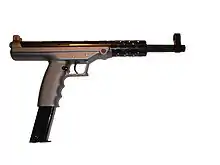 The Claridge Hi-Tec and its antecedent the Goncz High-Tech Long Pistol are semi-automatic pistols designed by Hungarian inventor Lajos John Goncz.[2][3] This unique firearm features a telescopic bolt design encased in a tubular upper receiver with a forged steel frame, button rifled match barrels, and 16-round magazines standard.