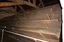 Water is diverted from the river by Warleigh Weir, about 200 yards (183 m) upstream. The water flows to the pumping station down a 30-foot (9.1 m) wide leat, which is crossed by a single segmental arch bridge with a central keystone.[5] The water passes over depressing sluices which can be raised or lowered by hand cranking, and then powers a breastshot water wheel. The 24-foot (7 m) wide wheel is in two sections, each 12 feet (3.7 m) wide and 17 feet (5 m) in diameter, with a 9-inch (23 cm) gap between them.[6][7] The wheel has 48 wooden starts on each of the six cast iron rims. These starts support 96 float boards each of which is 13 inches (33 cm) by 1 inch (2.5 cm) by 12 feet (3.7 m), and is paired with a 11 inches (28 cm) seal board bolted directly to the rim. The original timber selection for the wheel is not known, but since 1983 the starts have been made from Iroko due to its longevity even in conditions where it is cycled between submerged and dry due to intermittent running.[8] The breastshot wheel is vertically mounted, and falling water strikes the blades. Breastshot wheels are less efficient than backshot or overshot wheels,[9] but more efficient than undershot wheels.