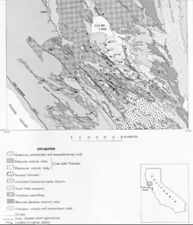 The Clear Lake Volcanic Field is a volcanic field beside Clear Lake in California's northern Coast Ranges. The site of late-Pliocene to early Holocene activity, the volcanic field consists of lava domes, cinder cones, and maars with eruptive products varying from basalt to rhyolite.[2] The site's threat level is ranked "High" at #33 in the top volcanic threats in the United States according to "2018 Update to the U.S. Geological Survey National Volcanic Threat Assessment". The last eruption being about 11,000 years ago. Cobb Mountain and Mount Konocti are the two highest peaks in the volcanic field, at 4,724 feet (1,440 m)[1] and 4,285 feet (1,306 m)[4] respectively.