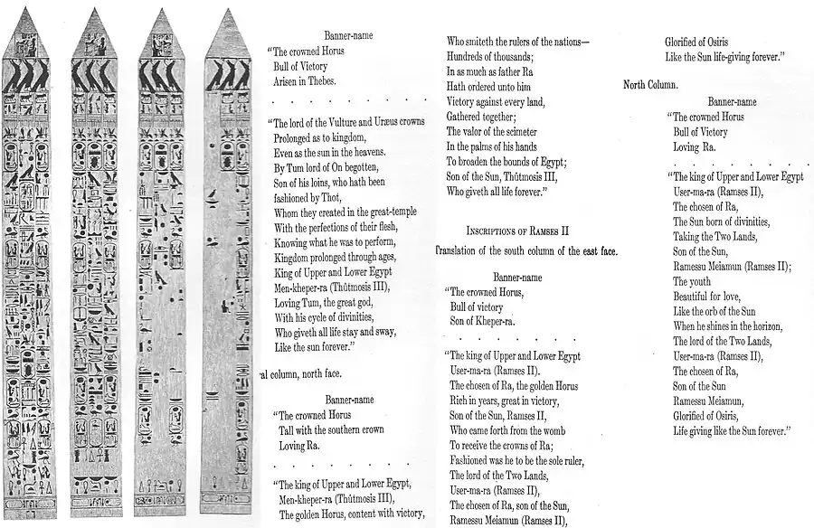 - ↑ Farman, Elbert E. (1908). "History of Obelisk and Inscription". Egypt and its Betrayal. New York City: Grafton Press. pp. 189–191. Retrieved March 22, 2023 – via Google Books.