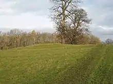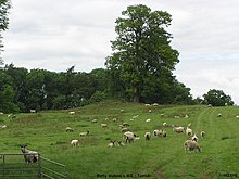 The Betty Watson's Hill Bronze Age barrow 1,120 feet (340 m) east of Cliffe Hall was excavated in 1904. It was described as a flat-topped bowl barrow, and it was noted that "the large hole in the centre is probably due to robbers or an unrecorded excavation".[37][38] In 2007, a cup-marked 29×23×16 cm boulder with two 5 cm cups was found in field-edge dumps 50m south-east of the Betty Watson's Hill barrow. "The cobble was removed from the field edge and placed back on the barrow top. This now puts an early Bronze Age date to the monument." The boulder is believed to have originated in the robbed-out barrow.[4][39] A round barrow is recorded 190m south-east of Cliffe Hall.[4][40]