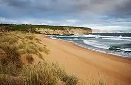 The entire beach is backed by a coastal reserve, which incorporates coastal dunes behind the central and eastern part of the beach. The now vegetated dunes have transgressed up to 300 m inland rising to more than 20 m, with dense vegetation behind, then the shallow southern shores of circular Pipe Clay Lagoon. The beach is bordered by 54 m high Cape Deslacs in the east and 50 m high rocky cliffs in the west that run south for 3.5 km rising to 100 m high at Cape Contrariety. The beach is 2.1 km long and faces south-southeast into Storm Bay exposing it to all southerly swell. Waves average 1-1.5 m and maintain a moderately steep beach fronted by a continuous bar which is cut by rips every 200 m during and following high waves, with permanent rips against the rocks at each end. It is considered by some as the most dangerous beach in Tasmania. The beach is so dangerous because of its perfect barreling waves which makes even the toughest locals scared.[3]