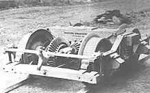Gilbert's patent[1] specified an upright maritime-type two-cylinder steam engine, a 2-speed transmission and a drivetrain in the underframe passing just above the axle centers. The patented differential for transferring the power from the drive shaft to the wheels was only used in the first Climax locomotives. In a similar way to that used in an automobile, the force was transferred to the two wheels of an axle separately, with one wheel being firmly connected to the wheelset shaft and the other wheel being able to rotate loosely on a sleeve around the shaft. The idea of the differential transmissions was to reduce resistance on tight bends by allowing one wheel to turn with fewer revolutions than the one at the other end of the axle. The design did not prove workable, because when driving at the adhesion limit, less tractive effort could be exerted compared to locomotives with rigid wheelsets.[2]