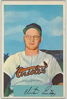 Courtney remained the starting catcher in 1954, as the Browns moved to Baltimore and became the Orioles.[8] In the first MLB game at Memorial Stadium, on April 15, Courtney hit the first home run in the stadium's history, a solo shot against Virgil Trucks in a 3–1 win over the White Sox.[1][27] Against the Washington Senators on August 29, Courtney had five hits and two RBI in a 5–0 victory.[28] In 122 games, he batted .270 with 25 runs scored, 107 hits, 4 home runs, and 37 RBI.[6] He struck out a mere 7 times in 397 at bats (1.8 percent of the time), setting a franchise record for lowest strikeout percentage.[1][29] On November 17, the Orioles made a 17-player trade with the Yankees, acquiring catchers Hal W. Smith and Gus Triandos.[1][8] This made Courtney expendable, and he was traded to the White Sox on December 6. Jim Brideweser and Bob Chakales were part of the trade, which brought Baltimore Matt Batts, Don Ferrarese, Don Johnson and Fred Marsh in return.[6][8]