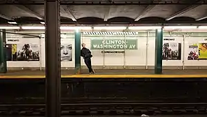Both platforms have a light green trim line with a dark green border and mosaic name tablets reading "CLINTON - WASHINGTON AV." on two lines in white sans-serif lettering on a dark green background and a lighter green border. Beneath the trim line and name tablets are small tile directional signs and station names (alternating between "CLINTON" and "WASHINGTON") in white lettering on a black background. The tiles were part of a color-coded tile system used throughout the IND.[7] The tile colors were designed to facilitate navigation for travelers going away from Lower Manhattan. Because the Crosstown Line does not merge into a line that enters Manhattan at either end, all stations on the line had green tiles.[8][9] Hunter green (previously yellow) I-beam columns run along both platforms at regular intervals, alternating ones having the standard black station name plate in white lettering.