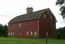 The barn is a gambrel-roofed frame building. The barn is 80 feet (24 m) long by 40 feet (12 m) and 44 feet (13 m) high. The eaves are 27 feet (8.2 m) above the ground. A cupola is centered on the roof. The exterior of the barn was originally red siding with white trim along the roof and down the corners. In the 1950s a white gypsum siding was placed over the original wood siding. The foundation is built of cut stone hauled from Joliet Prison in Joliet, Illinois.[3] There are two large sliding doors located in the middle of the north and south walls. These doors have been altered from their original position and several small doors have been added.[3] All the windows are original. Each is a pedimented, double-hung sash windows with six over six lights. Fourteen are on the lower half of the barn (North 6, East 1, South 6, West 1) with the remaining 8 higher on the walls.[3] A number of fixed sash windows were added in the 1950s,[3] but have been removed by the summer of 2014.[4] The gambrel roof is covered with cedar shake shingles.[3] The cupola has shuttered windows all four directions with four gables. A metal trim tops each gable.[4]