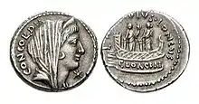 The small, circular shrine of Venus Cloacina was situated before the Basilica Aemilia on the Roman Forum and directly above the Cloaca Maxima. Some Roman coins had images of Cloacina's shrine. The clearest show two females, presumed to be deities, each with a bird perched on a pillar. One holds a small object, possibly a flower; birds and flowers are signs of Venus, among other deities. The figures may have represented the two aspects of the divinity, Cloacina-Venus.[5]