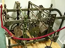 As of 2010, the original 1836 turret clock mechanism by John Moore Junior (later John Moore & Sons) was on display at Herne Bay Museum and Gallery, having been replaced in 1971.[25][26] The mechanism is sometimes erroneously attributed to Peter Morton of Herne Bay and John Greenwood of Canterbury because their names are engraved on the front, however they were the suppliers and could not have manufactured such a large mechanism. This mechanism is listed in John Moore's 1877 catalogue as: "Herne Bay, Kent. Four 5ft dials, the gift of Mrs Thwaites (sic)." It was installed in the tower on a trestle and encased in a deal box, with doors for access to the winding mechanism. It had extra brass wheels for the striking bell, and was held in an iron frame. The clock had to be wound twice a week, the clock weights providing the stored energy. The pendulum was about 12 feet (3.7 m) long, giving a slow beat of nearly two seconds.[26] The clock winder had to ascend 66 steps, then turn the heavy strike winder 75 times, and the time winder 20 times, using a crank.[19] The bell, made of bell metal, was supplied by Thomas Mears II in 1837, weighs 12 cwt and measures 36 inches (91 cm) high and 46 inches (120 cm) diameter. The bell is still functioning in the Tower.[27]
