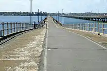 Clontarf is connected to Brisbane City, across Bramble Bay, by the Houghton Highway which is a 2.7 km long causeway that provides access to the southern tip of the Redcliffe Peninsula, greatly decreasing the travel time between Redcliffe and Brisbane. The current pair of bridges, Houghton Highway and its twin Ted Smout Memorial Bridge, replaced the original Hornibrook Bridge which is now closed and mostly removed except for a short span (on the north) and the two iconic bridge entrance towers that were retained to form a very popular fishing pier at the northern and southern ends of Bramble Bay.