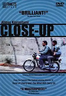 Close-Up (Persian: کلوزآپ ، نمای نزدیک, Klūzāp, nemā-ye nazdīk) is a 1990 Iranian docufiction written, directed and edited by Abbas Kiarostami. The film tells the story of the real-life trial of a man who impersonated film-maker Mohsen Makhmalbaf, conning a family into believing they would star in his new film.[1] It features the people involved, acting as themselves. A film about human identity, it helped to increase recognition of Kiarostami internationally.