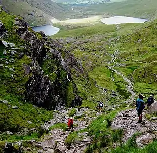 Cnoc na Toinne is most frequently encountered as the minor summit that forms the col with Carrauntoohil, through which most hill walkers travel on their way summiting Ireland's highest mountain. The col is most commonly accessed from the Hag's Glen (via Cronin's Yard), by ascending a loose rocky path known as the Devil's Ladder (see photo opposite).[lower-alpha 2][4][5]