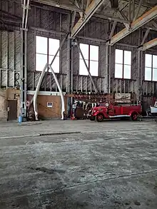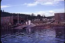 After the war the buildings were bought by B.C. Packers[4] and whaling operations began. Whales were harpooned by a fleet of up to five small "chasers" with harpoon guns. Whales were brought up by steam windlass on the main slipway formerly used by planes and then flensed (stripped of their blubber) on the concourse and processed indoors. By-products included protein feed for animals, and fertilizer.[5] The plant was powered by two World War II US destroyer steam engines.