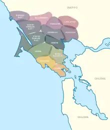 These tribes did not have a political structure and so are not "tribes" in that sense.[12] Rather, chiefs or headmen (oi-bu in Olamentko[13] and hoipu in Hookooeko) were empowered at the tribelet level. The Coast Miwok did not have a single name for all three tribes, describing themselves instead by tribe, tribelet, or village, depending on the context. Using Merriam's divisions, the tribelets as shown on the map to the right - itself derived from Milliken[12] - can be classified as: