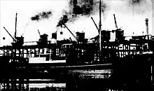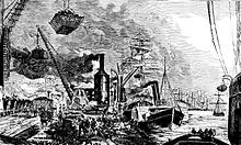 The first wharves on the Basin were those on the eastern side, opposite the wharves of the Dyke.[95] At first, the Basin was used as mooring and as a location to unload ballast. By mid-1903, two—of eventually six—coal loading cranes were operating there,[98] essentially as an extension to the loading operations of the Dyke. In 1913, work was underway on another line of wharves, on the western side of the Basin.[99] Those new wharves were completed in 1915.[100]