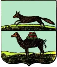 The first coat of arms for the city was approved by Catherine II on 8 June 1782.[4] It was designed by councillor A.O. Volkov and consisted of a shield that was split in half horizontally. The top half featured a marten running along a green field. The marten was a symbol of the Ufa governorship and was featured on the governorship's coat of arms, so it was incorporated to represent the city's position within the governorship. A camel loaded with goods was on the bottom half, representing the commercial significance of the city. The camel symbolism dates back to at least 1737, when Vasily Tatishchev presented two proposals for the emblem of Isetsky District, where the city was located at the time. One proposal featured a camel tied down as the principal charge and both featured a camel head and neck on the crest. The camel likely symbolized Russia's interests in building fortresses in the Asian region to protect the economic benefits present.[5]