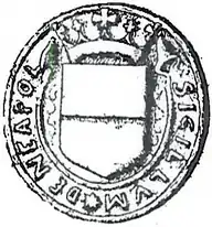 The first evidence in which the current coat of arms is used in an official document of the city is an act dated 31 January 1488, with which the Electi Civitatis Neapolis lodge an appeal against some Gabelles; the document has a seal imprinted on paper in turn attached to the sheet with red wax, on the seal there is the city coat of arms surmounted by a ducal crown and surrounded by the legend Sigillvm