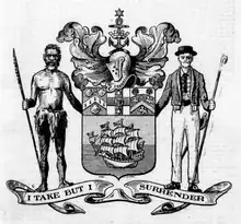The coat of arms of Sydney was granted to the city on 30 July 1908 by England's College of Arms.[1] It features a three-masted ship on a gold and blue background, along with symbols pertaining to various figures in Sydney's history (namely Viscount Sydney, Governor Phillip, Captain Cook, and Sir Thomas Hughes). The crest is an anchor encircled by a mural crown and surmounted by a six-pointed star, and the supporters are an Aboriginal and an 18th century British seaman. The motto is "I take but I surrender". An interpretation published alongside the grant of arms explains this as follows: