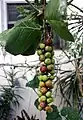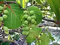 In late summer, it bears green fruit, about 2 cm (0.79 in) diameter, in large, grape-like clusters.[3] The fruit gradually ripens to a purplish color. Each contains a large pit that constitutes most of the volume of the fruit.