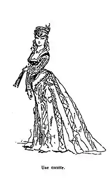 Cocottes (or coquettes) were high class prostitutes (courtesans) in France during the Second Empire and the Belle Époque.[1] They were also known as demi-mondes and grandes horizontales.[2] Cocotte was originally a term of endearment for small children, but was used as a term for elegant prostitutes from the 1860s.[3] The term was also used in Wilhelmine and Weimar Germany from the turn of the 20th century (Kokotte).[4]