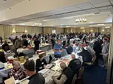 A coin show is an event where coin collectors and coin dealers attend to buy, trade and sell coins.[1] Like other hobby shows, a show hall is arranged with aisles and tables where coin sellers can display their coins. In cities across the United States there are thirty to fifty smaller local shows each weekend. The American Numismatic Association hosts national shows each year that may feature up to 1000 coin dealers.[2]