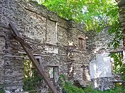 The Colden Mansion Ruins are located in the Town of Montgomery, New York, United States, along NY 17K, at the intersection of Stone Castle Road and Route 17K. The stone walls and foundations, still visible in the woods just off the road, are all that still stands from the house built in 1767 by Cadwallader Colden Jr., son of Cadwallader Colden, and his wife Elizabeth Ellison of New Windsor.[2] The entire area, once the 3,000-acre (12 km2) family farm, is still known as Coldenham and East Coldenham, and the Colden Family Cemetery is approximately a mile (1.6 km) to the southwest.