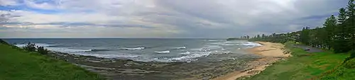 A panorama overlooking Sharkey's beach facing south in the direction of the Headlands Hotel, which is an easy 20-30 minute walk from the Coledale shops. There is also well maintained cycle route that will allow for an off-road journey all the way into Wollongong. This route does break up a little between Thirroul & Bulli, but in the summer months it is easy to find your way if you follow other cyclists.
